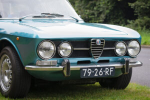 Wierden, Overijssel, Netherlands, september 17th 2016, close-up of the frontdide of a blue Dutch classic 1971 Alfa Romeo 1750 GT Veloce 2-doors coupe car parked on grass alongside the road – the car is also known as the ”1750 GTV” and was produced from 1967–1972 by Turin based Italian car manufacturer Alfa Romeo